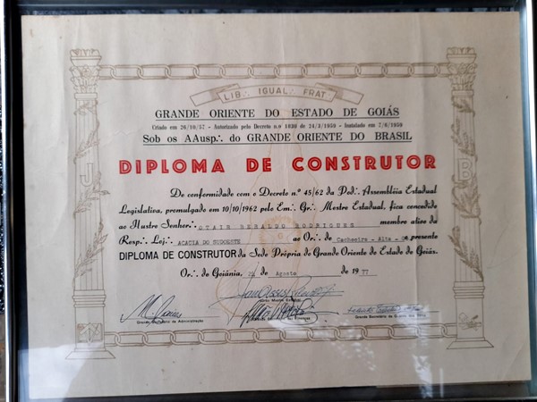Diploma de Construtor, emitido pelo Grande Oriente do Estado de Goiás