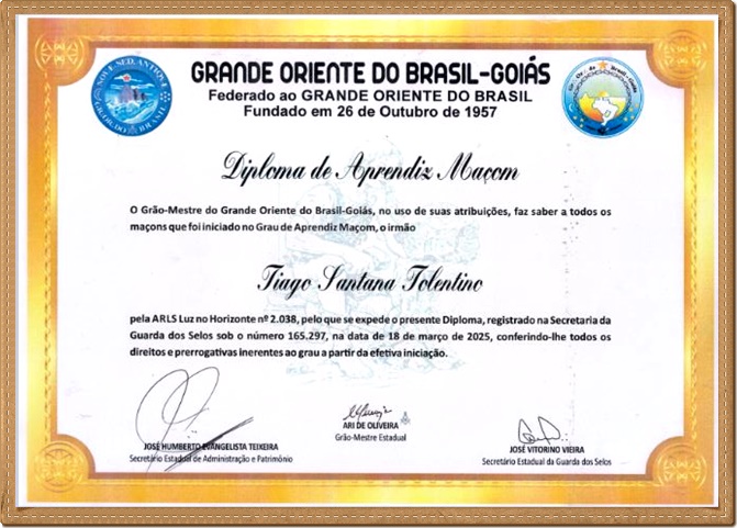 Diploma de Aprendiz Maçom emitido pelo Grande Oriente do Brasil - Goiás - GOB-GO Abel Tolentino Atualização 08/08/2025 O que é a maçonaria - Histórico da Loja - Eventos - Fotos - Fraternidade Feminina - Rito Brasileiro - Peças de Arquitetura - Avental - Brasão - Assembleia - Academia |